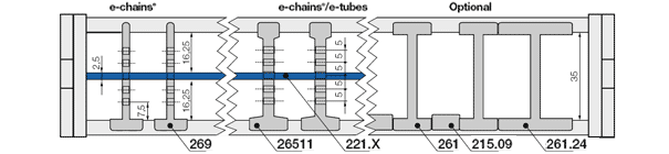Systém autoglide je nyní rozšířen pro igus® E2/000 a dále optimalizován. Větší kluzné povrchy na opěrách autoglide ještě více prodlužují životnost systému. Zacvakávací kluzné boční křídlo zajistí, že je řetěz e-chain® bezpečně vyrovnán na prvních metrech pojezdu. Excentrické vodící díly jsou upevněny k podlaze každé 2 m.