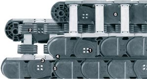 Na údržbu nenáročné válečkové řetězy e-chain system® optimalizovanými trio plastovými kladkami