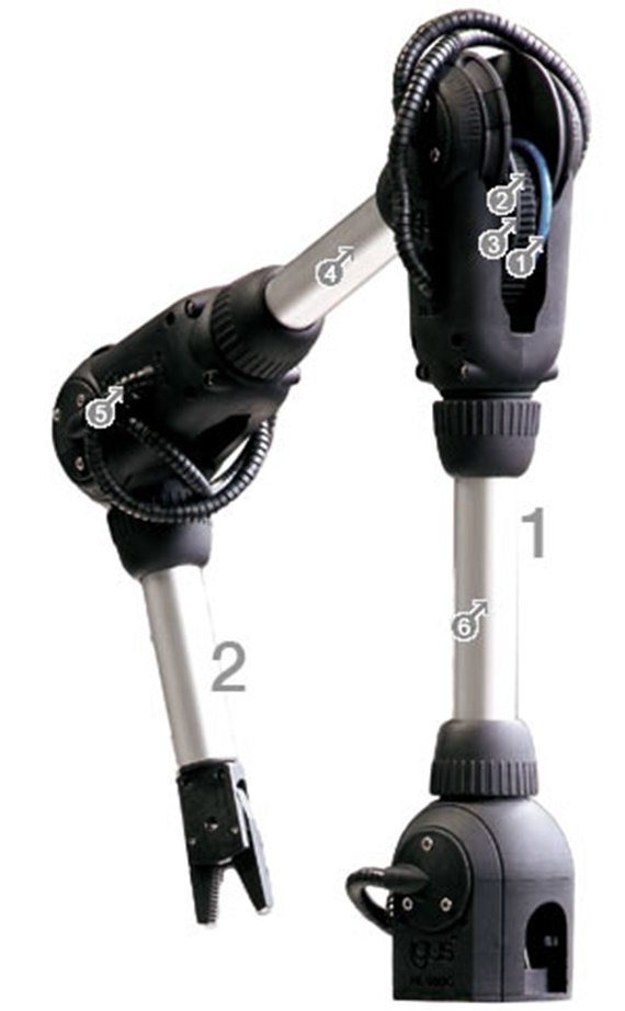 All joints are operated with draw wires. 2 wires are needed for each degree of freedom (antagonistic principle). If the wires of the upper joint (2) were to be routed through the lower joint (1) without being guided, the movements of the two joints would no longer be independent of each other. In order to achieve this independence, it is necessary that the wire tension of the upper joint (2) is uncoupled from the movements of the lower joint (1). This is done by means of a special Bowden cable system in the opening of the lower joint (see illustration). The wires them move freely next to each other in the connecting tubes between the joints.
