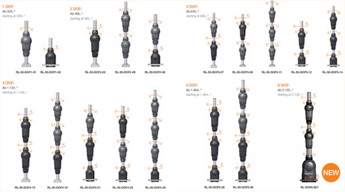 Each individual joint is fitted with draw wires. In each case, they must be taken through the joint underneath. This means that not just any combination of joints is possible. However, it is possible to combine individual joints with 1 to 6 DOFs and implement very different kinematics. We will happily advise you. The following illustration shows some possible combinations, whereby there are innumerable further possibilities if the newer types of joint, i.e. the RL-50-003 and RL-90-BL1, are taken into account!